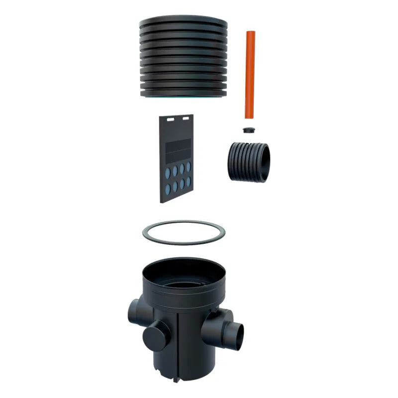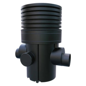 This model has a rotational moulded chamber base with 300mm or 450mm main channel socket connections including two further 300mm side inlets at 90°, 270° from the outlet at 0°. Side inlets are supplied as blanked ends that can be used as required