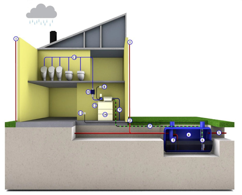 Collected rainwater is pumped or gravity fed to a low level break tank. In turn, the water is then gravity fed to an integral or external booster pump system for onward distribution to the serviced appliances