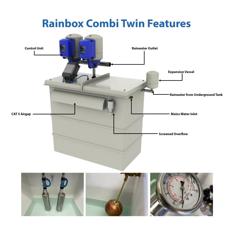 {"id":15440720068992,"title":"Rainbox Combi Rainwater Harvesting System","handle":"rainbox-combi-rainwater-harvesting-system","description":"\u003cp\u003e\u003cstrong\u003e\u003cem\u003ePrice based on single set below ground pump. Twin set is available, please get in touch if required\u003c\/em\u003e \u003c\/strong\u003e\u003c\/p\u003e\n\u003cp\u003e\u003cspan\u003eThe \u003c\/span\u003e\u003cspan name=\"searchHitInReadingPane\" id=\"0.8550192654954223\" class=\"highlight\"\u003eRainBox\u003c\/span\u003e\u003cspan\u003e Combi is your all-in-one solution to effortlessly collect and reuse rainwater, cutting water bills while being eco-friendly! \u003c\/span\u003e\u003cbr\u003e\u003cbr\u003e\u003cspan\u003eEach \u003c\/span\u003e\u003cspan name=\"searchHitInReadingPane\" id=\"0.11440728697294356\" class=\"highlight\"\u003eRainBox\u003c\/span\u003e\u003cspan\u003e Combi includes a durable underground GRP chamber for water collection and a high-performance booster set inside your property, ensuring a smooth and reliable flow to all your essential outlets.\u003c\/span\u003e\u003c\/p\u003e\n\u003cp\u003e\u003cspan\u003e\u003cstrong\u003eWhy use the RainBox Combi?\u003c\/strong\u003e\u003cbr\u003eSustainability and being environmentally conscious are key factors when implementing various aspects of a construction project. The ability to harvest rainwater to reduce the impact on the environment is the primary function of the Rainbox Combi. \u003c\/span\u003e\u003c\/p\u003e\n\u003cp\u003e\u003cspan\u003eIn addition to being environmentally friendly the RainBox Combi has the added benefit of lowering utility costs for the end user by replacing up to 80% of commercially available mains supplied water with collected rain water. \u003c\/span\u003e\u003c\/p\u003e\n\u003cp\u003e\u003cspan\u003eThe RainBox Combi allows you to comply with government mandated code when constructing sustainable housing. Additionally, rainwater harvesting scores highly with the Water Efficiency sector of the BREEAM accreditation scheme and can help gain planning permission by meeting site drainage guidelines (Building Regulations Part H) as part of a sustainable drainage (SUDS) scheme.\u003c\/span\u003e\u003c\/p\u003e\n\u003cp\u003e\u003cspan\u003e\u003cstrong\u003eHow does the RainBox Combi Work?\u003c\/strong\u003e\u003cbr\u003eCollected rainwater is pumped or gravity fed to a low level break tank. In turn, the water is then gravity fed to an integral or external booster pump system for onward distribution to the serviced appliances\u003c\/span\u003e\u003c\/p\u003e\n\u003cp\u003e\u003cspan\u003e\u003cstrong\u003eProduct Features\u003c\/strong\u003e\u003c\/span\u003e\u003c\/p\u003e\n\u003cul\u003e\n\u003cli\u003e\n\u003cspan\u003e\u003c\/span\u003e\u003cspan\u003eGRP structure for both tank\u003c\/span\u003e\n\u003c\/li\u003e\n\u003cli\u003e\u003cspan\u003eVariable speed water booster with FlyVar controller\u003c\/span\u003e\u003c\/li\u003e\n\u003cli\u003e\u003cspan\u003eIncrease pressure to your building\u003c\/span\u003e\u003c\/li\u003e\n\u003cli\u003e\u003cspan\u003eMains water top up on CAT 5 WRAS approved tank\u003c\/span\u003e\u003c\/li\u003e\n\u003cli\u003e\u003cspan\u003eQuiet operation submersible pumps\u003c\/span\u003e\u003c\/li\u003e\n\u003cli\u003e\u003cspan\u003ePressure and flow control\u003c\/span\u003e\u003c\/li\u003e\n\u003c\/ul\u003e\n\u003cp\u003e\u003cstrong\u003eProduct Benefits\u003c\/strong\u003e\u003c\/p\u003e\n\u003cul\u003e\n\u003cli\u003e\u003cspan\u003eFully configurable for additional electrical devices such as ultra-violet systems\u003c\/span\u003e\u003c\/li\u003e\n\u003cli\u003e\u003cspan\u003eCan substantially reduce your water bills\u003c\/span\u003e\u003c\/li\u003e\n\u003cli\u003e\u003cspan\u003eLowers carbon footprint\u003c\/span\u003e\u003c\/li\u003e\n\u003cli\u003e\u003cspan\u003eVarying flow and pressure as per your requirements\u003c\/span\u003e\u003c\/li\u003e\n\u003cli\u003e\u003cspan\u003eTelemetry available as optional extra with MS alerts\u003c\/span\u003e\u003c\/li\u003e\n\u003cli\u003e\u003cspan\u003eArrives at site with fixings and connectors\u003c\/span\u003e\u003c\/li\u003e\n\u003c\/ul\u003e\n\u003cp\u003e\u003cspan\u003e\u003cstrong\u003eSystem Breakdown\u003c\/strong\u003e\u003c\/span\u003e\u003c\/p\u003e\n\u003col\u003e\n\u003cli\u003e\u003cspan\u003eRainwater is collected from the roof area of the property\u003c\/span\u003e\u003c\/li\u003e\n\u003cli\u003e\u003cspan\u003eThe rainwater then enters sealed gulleys on the property\u003c\/span\u003e\u003c\/li\u003e\n\u003cli\u003e\u003cspan\u003eWater then enters an internal filter and sediment trap\u003c\/span\u003e\u003c\/li\u003e\n\u003cli\u003e\u003cspan\u003eCollected water then sits in the below ground storage tank\u003c\/span\u003e\u003c\/li\u003e\n\u003cli\u003e\u003cspan\u003eOverflow to storm drain or soakaway\u003c\/span\u003e\u003c\/li\u003e\n\u003cli\u003e\u003cspan\u003eSubmersible pump complete with dry run protection\u003c\/span\u003e\u003c\/li\u003e\n\u003cli\u003e\u003cspan\u003eRainwater pumped line to RainBox Combi system\u003c\/span\u003e\u003c\/li\u003e\n\u003cli\u003e\u003cspan\u003eLocal power supply\u003c\/span\u003e\u003c\/li\u003e\n\u003cli\u003e\u003cspan\u003eMains water supply to RainBox Combi system\u003c\/span\u003e\u003c\/li\u003e\n\u003cli\u003e\u003cspan\u003eUltraviolet disinfection unit (Optional but recommended)\u003c\/span\u003e\u003c\/li\u003e\n\u003cli\u003e\u003cspan\u003eLocal power supply for submersible pump unit\u003c\/span\u003e\u003c\/li\u003e\n\u003cli\u003e\u003cspan\u003eOverflow to drain\u003c\/span\u003e\u003c\/li\u003e\n\u003cli\u003e\u003cspan\u003eRainwater pumped from the RainBox Combi system\u003c\/span\u003e\u003c\/li\u003e\n\u003cli\u003e\u003cspan\u003eRainBox Combi system (with 500L break tank)\u003c\/span\u003e\u003c\/li\u003e\n\u003c\/ol\u003e\n\u003cp\u003e\u003cstrong\u003eSpecification: \u003c\/strong\u003e\u003c\/p\u003e\n\u003ctable xmlns=\"http:\/\/w