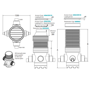 - Option of Reduction Cap 600450RC - This reduces the access diameter from 600mm to 450mm to accommodate a 450mm diameter access cover