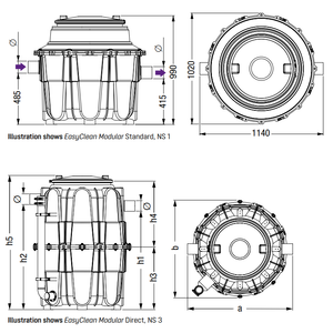 | NS | Ø (mm) | a (mm) | b (mm) | h1 (mm) | h2 (mm) | h3 (mm) | h4 (mm) | h5 (mm) | Weight (kg) | Sludge trap (l) | Water and grease (l) | Grease storage (l) | Total (l) |