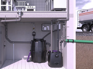 The collecting tank made of permanently resistant polymer (PE) is equipped with an integrated sludge trap. A service access cover with odour-tight cover and quick-release closures makes easy access possible for cleaning and maintenance work.