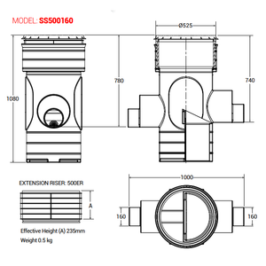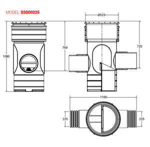 525mm diameter, factory built unit, delivered to site ready to install. Featuring a robust, impact resistant, rota moulded body with moulded pipe spigots that accommodate 160mm EN 1401 pipe fittings. There is an option of Ø225mm twinwall pipe connections (See Model: SS500225).